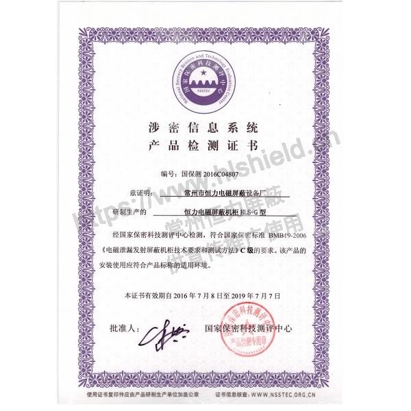 1. 具有國(guó)家保密局BMB19-2006《電磁泄露發(fā)射屏蔽機(jī)柜技術(shù)要求和測(cè)試方法》C級(jí)認(rèn)證的檢測(cè)證書(shū)及檢測(cè)報(bào)告。